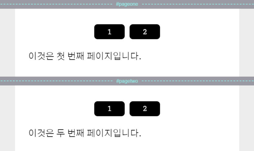 다른 페이지로 이동할 수 있는 버튼의 URL에는 section break 줄의 이름을 입력해 두었습니다. 1 버튼에는 #pageone을, 2 버튼에는 #pagetwo를 링크해 두었어요. 링크 시 #는 절대 빼먹어선 안 됩니다.